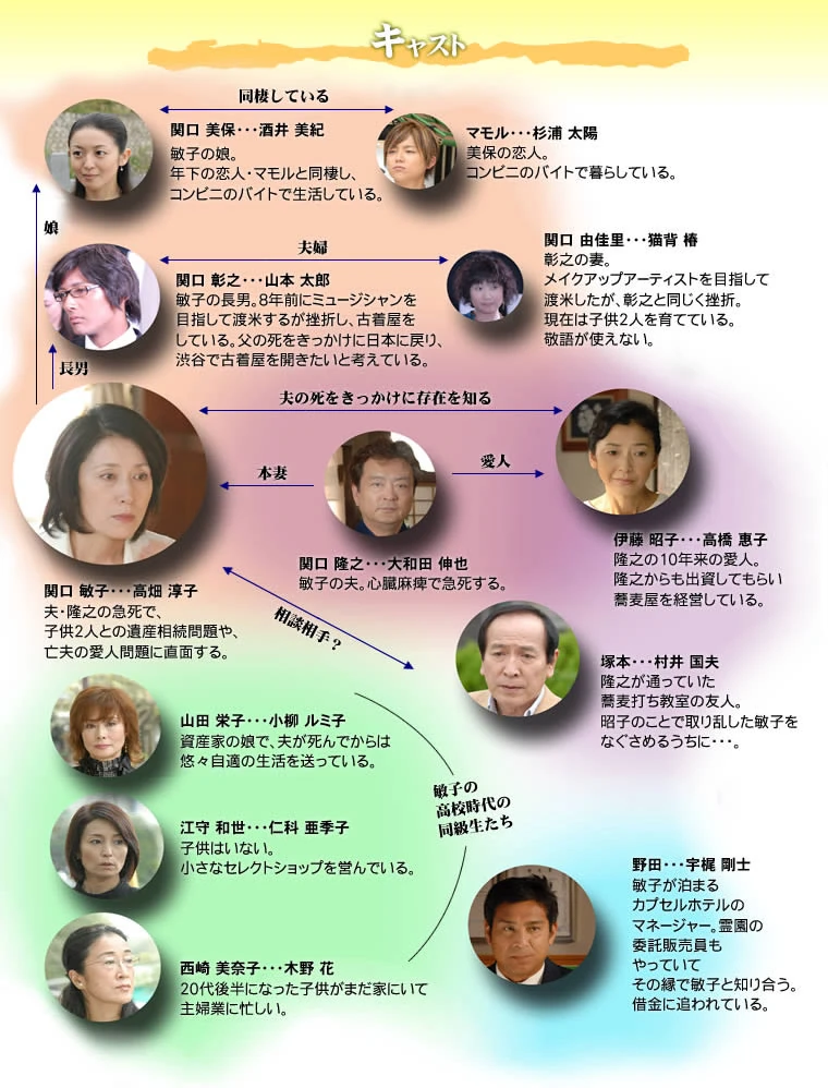 Una historia de una ama de casa de mediana edad cuya vida de repente cambia después de perder a su marido. Toshiko Sekiguchi, 55 años, es una ama de casa ordinaria que maneja la casa mientras su marido trabaja fuera. Después de la muerte repentina de su marido, ella se entera de que él ha hecho estafas durante más de diez años. Además, sus dos hijoscomienzan a pelear el uno con el otro sobre la herencia. Sintiéndose vacía, Toshiko se va de la casa. Tratando de encajar en una vida como mujer, no como madre o esposa, Toshiko decide forjarse una nueva vida. Basado en una novela por Natsuo Kirino.